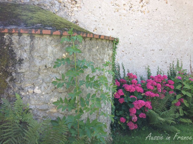 My pink hydrangeas next to the former pigsty (now the rubbish bin)